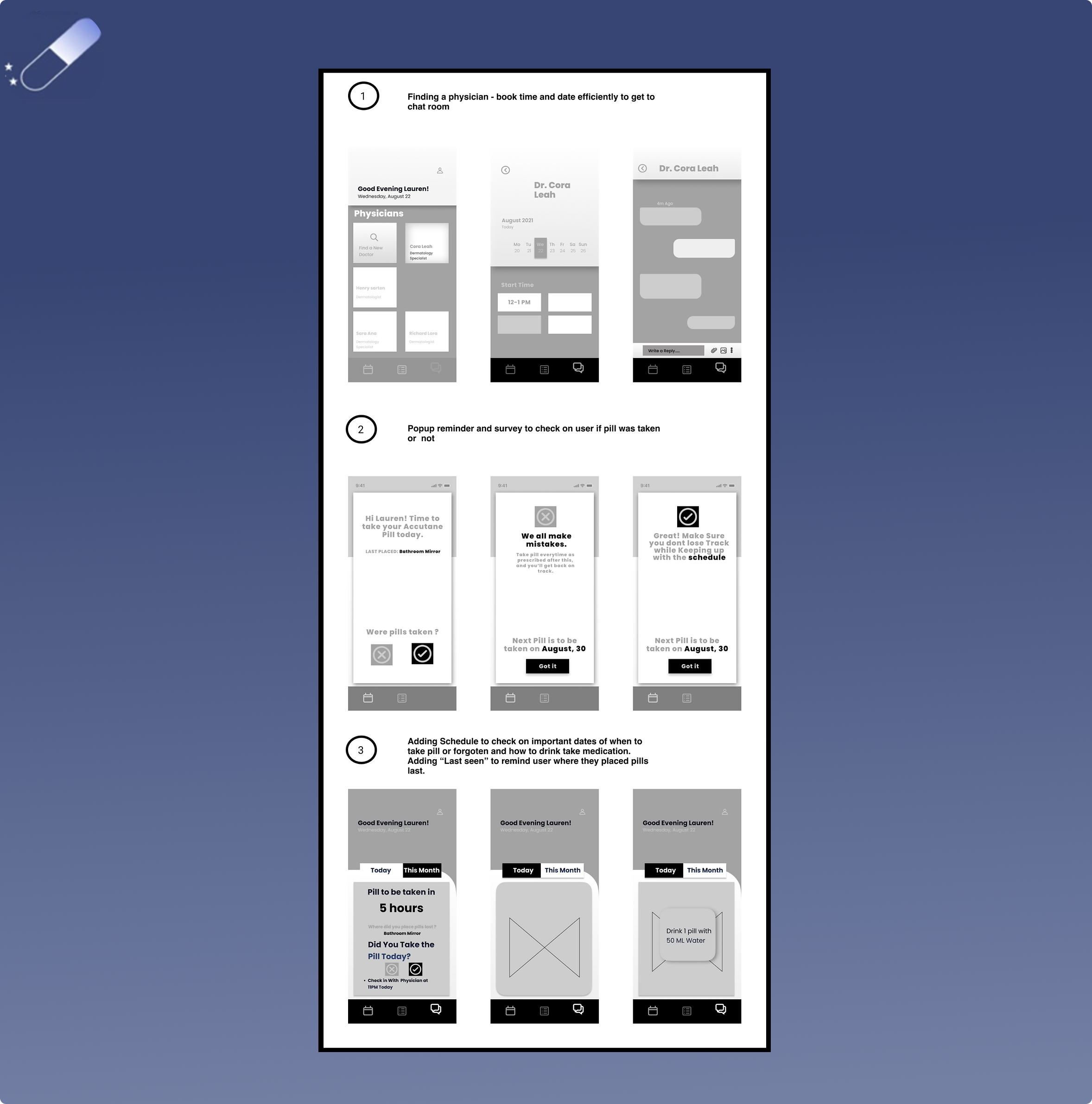 I began the project by conducting semi-structured interviews with Accutane patients to understand side effects and needs.